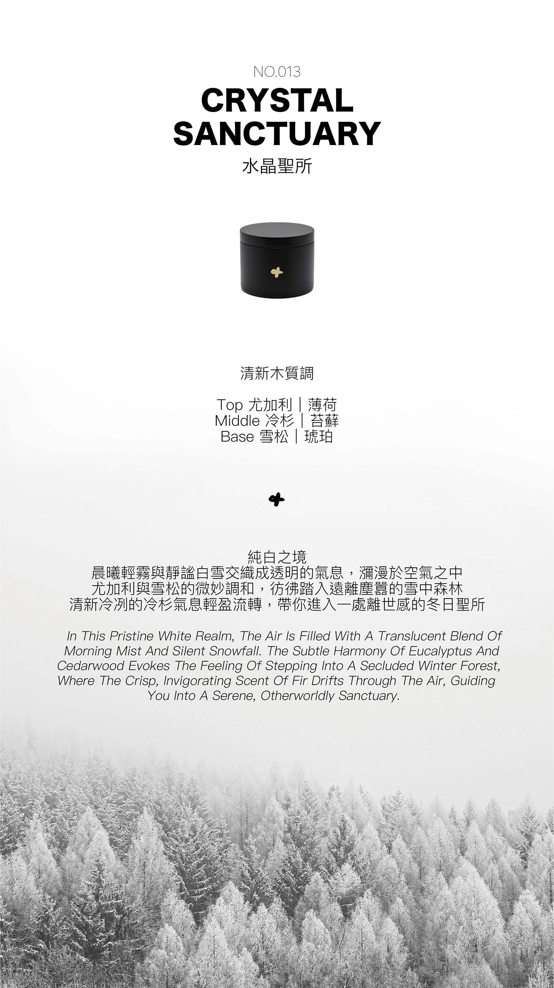 水晶聖所的香氛帶來遠離尘囂的逃避,宛如雪中聖地般的清新與寧靜,